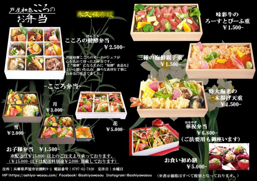 【1人前メニュー】※前日の15時までのご予約で承っております。こころ弁当 (雪)¥2000(月)¥3000(花)¥5000